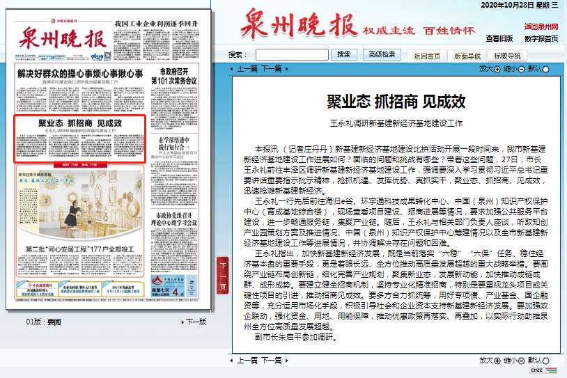 王永禮一行先后前往海歸e谷、環(huán)宇通科技成果轉化中心、中國(泉州)知識產權保護中心(育成基地綜合樓),現場查看項目建設、招商進展等情況,要求加強公共服務平臺建設,進一步暢通服務鏈,集聚產業(yè)鏈。隨后,王永禮與相關部門負責人座談,聽取知創(chuàng)產業(yè)園策劃方案及推進情況、中國(泉州)知識產權保護中心籌建情況以及全市新基建新經濟基地建設工作等進展情況,并協(xié)調解決存在問題和困難。