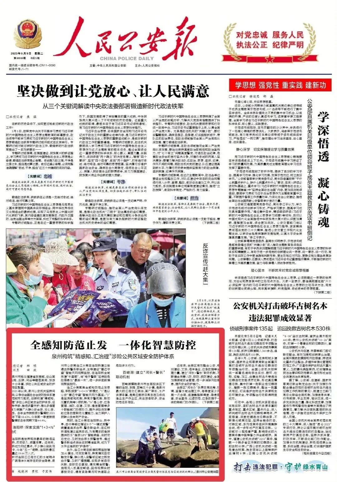 5月9日,《人民公安報(bào)》頭版以《全感知防范止發(fā) 一體化智慧防控》為題,大幅報(bào)道了泉州市公安局創(chuàng)新構(gòu)建“精感知、匯治理”涉險(xiǎn)公共區(qū)域安全防護(hù)體系,保障群眾安全游、放心游、快樂(lè)游的舉措和成效。