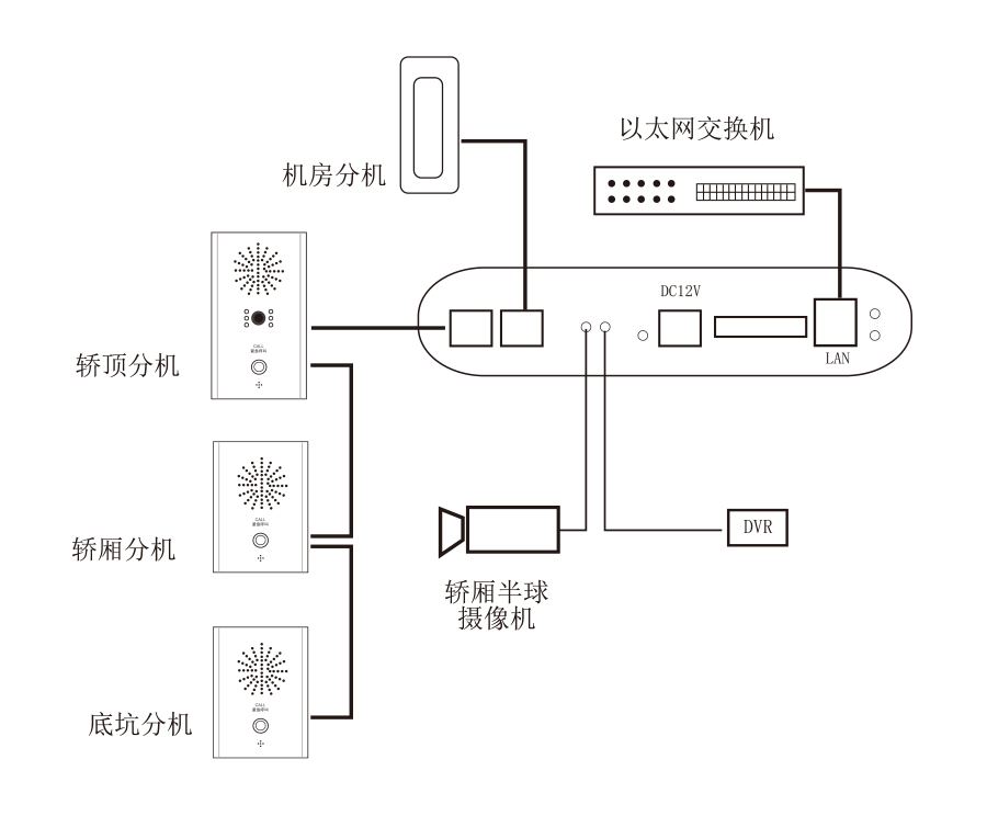 · 和分機連接,可實現(xiàn)機房、轎廂、轎頂、轎底四方通話;最多可外接8個分機,控制器與分機、分機與分機間都是手拉手式連接,總距離可達600米
